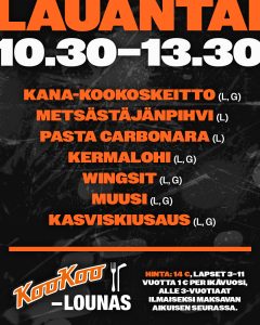 KooKoo-lounas palvelee mustaoranssina pelipäivänä klo 10.30–13.30! Lounaan hinta 14 €, lapset 3–11 vuotta 1 € per ikävuosi, alle 3-vuotiaat ilmaiseksi maksavan aikuisen seurassa.