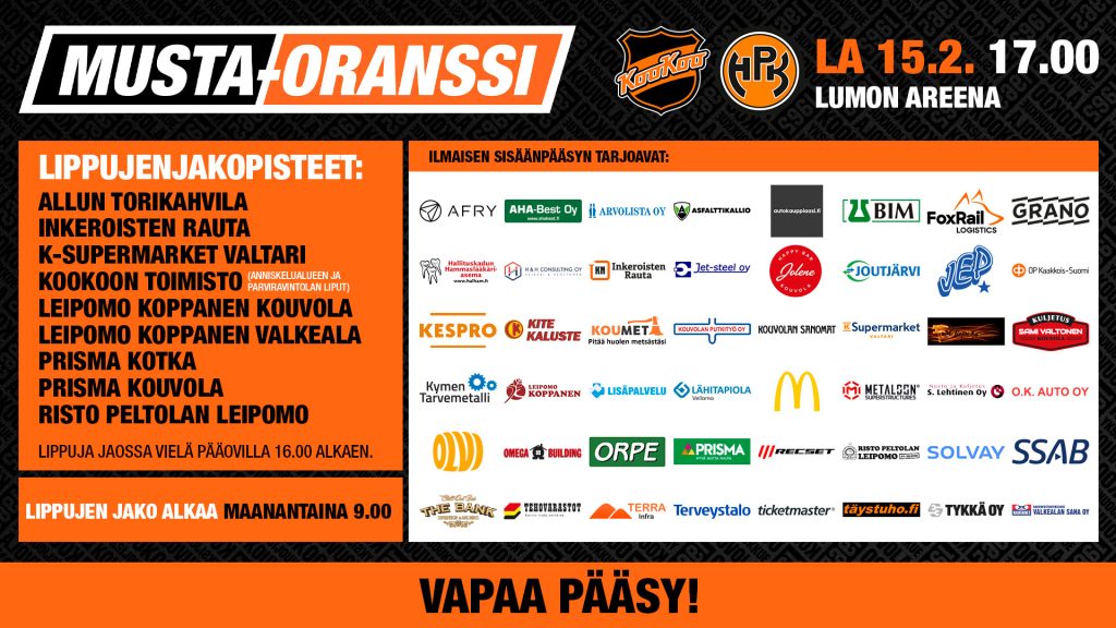 KooKoon Mustaoranssi-ilmaisottelu täyttää Lumon Areenan lauantaina.
