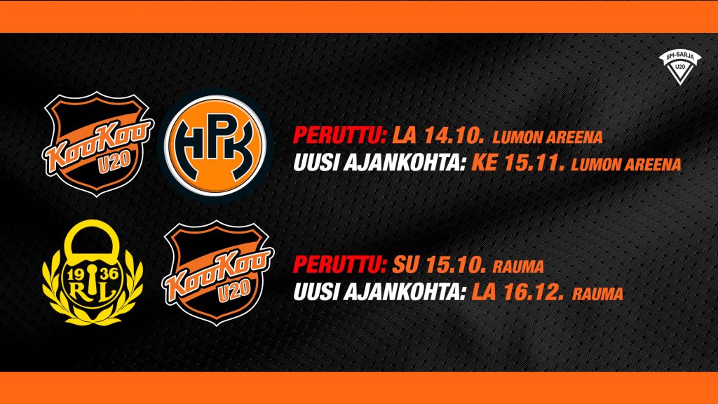 KooKoo U20-joukkueen ottelut HPK:ta ja Lukkoa vastaan siirtyvät myöhempiin ajankohtiin joukkueen sairastapausten vuoksi.